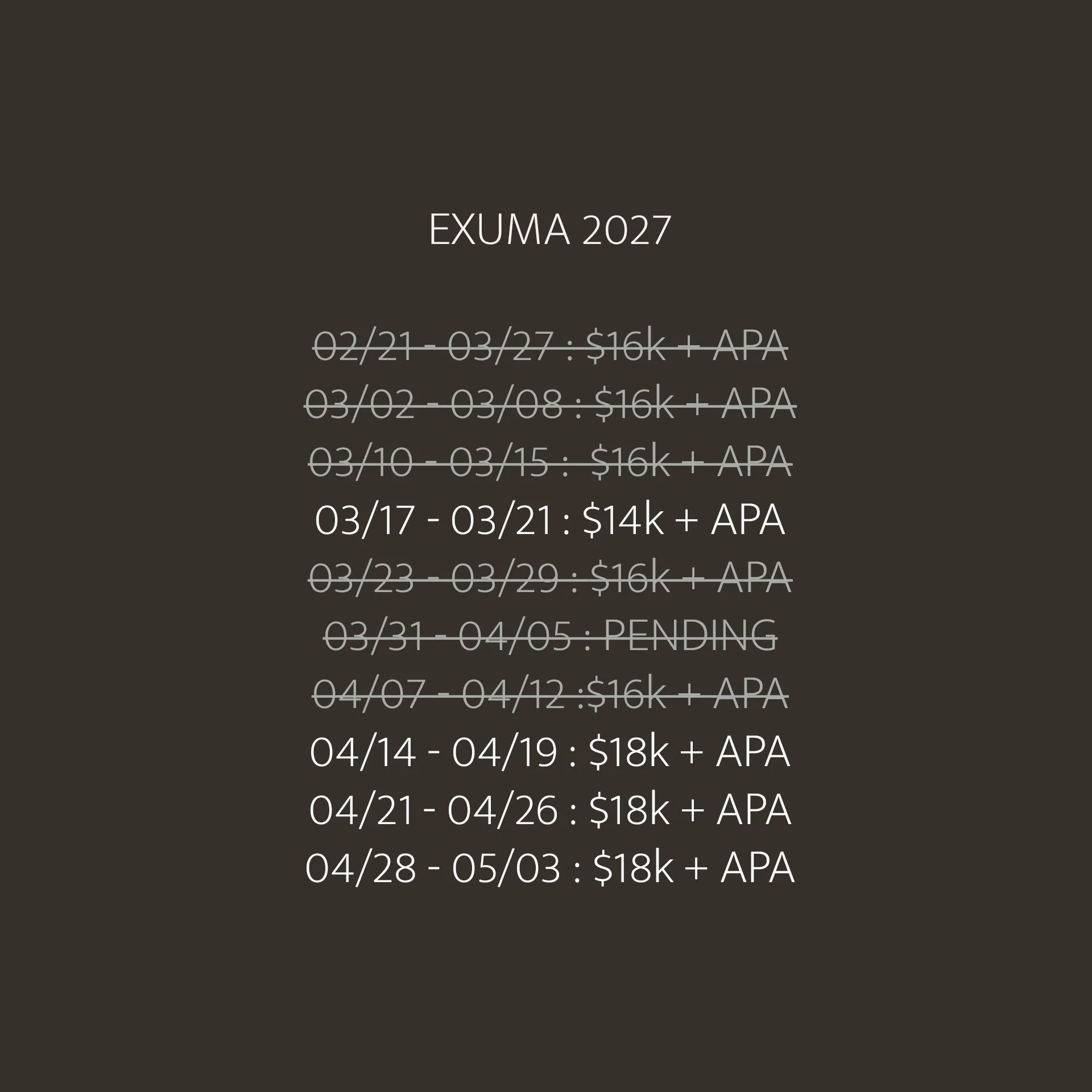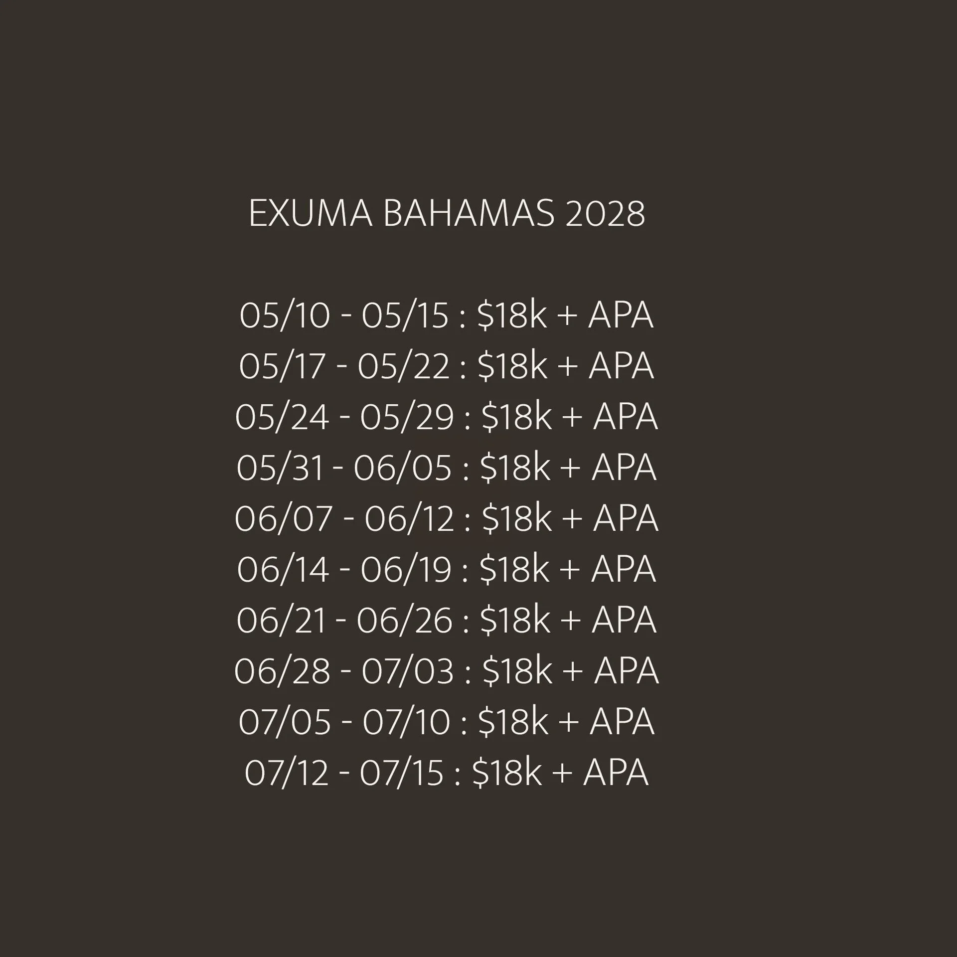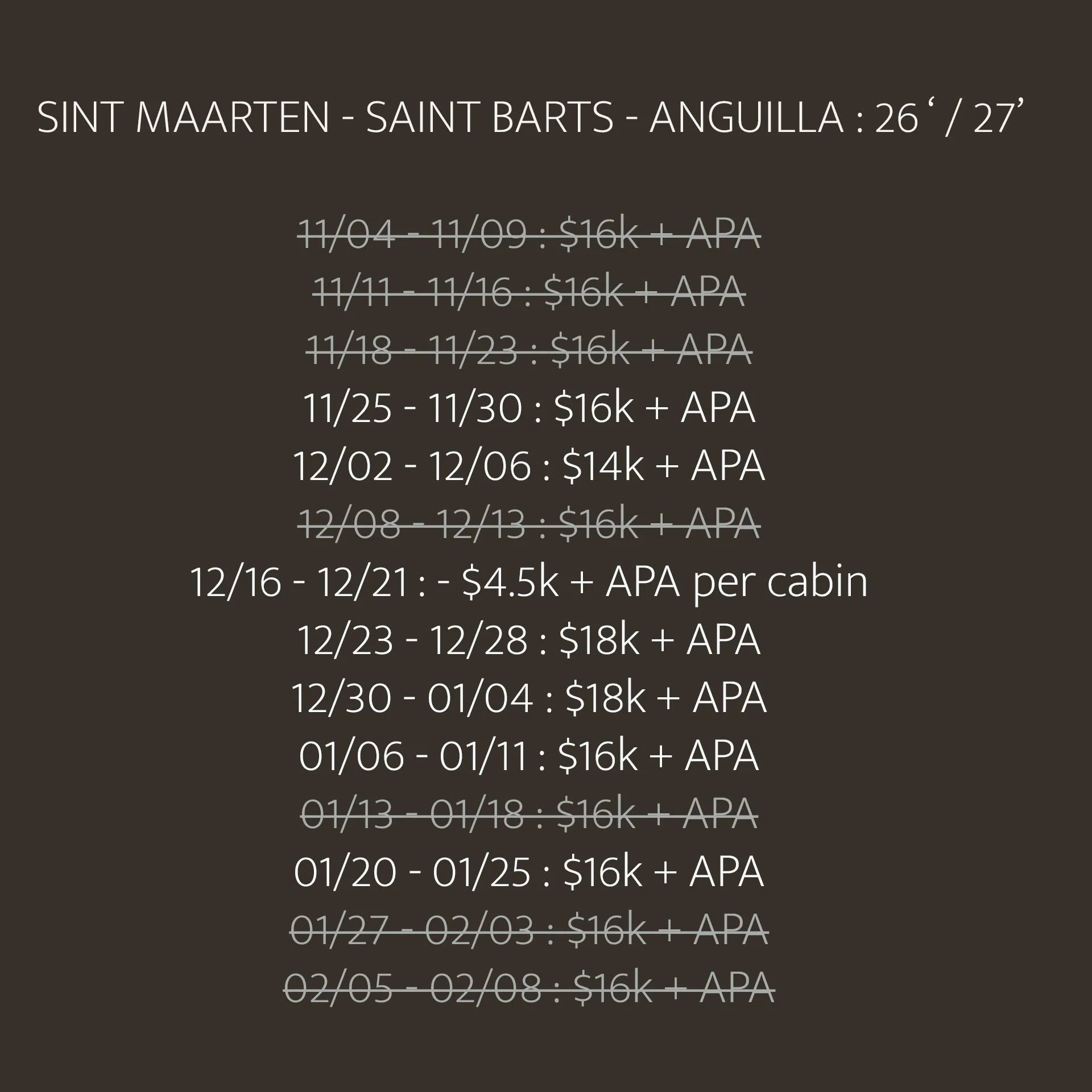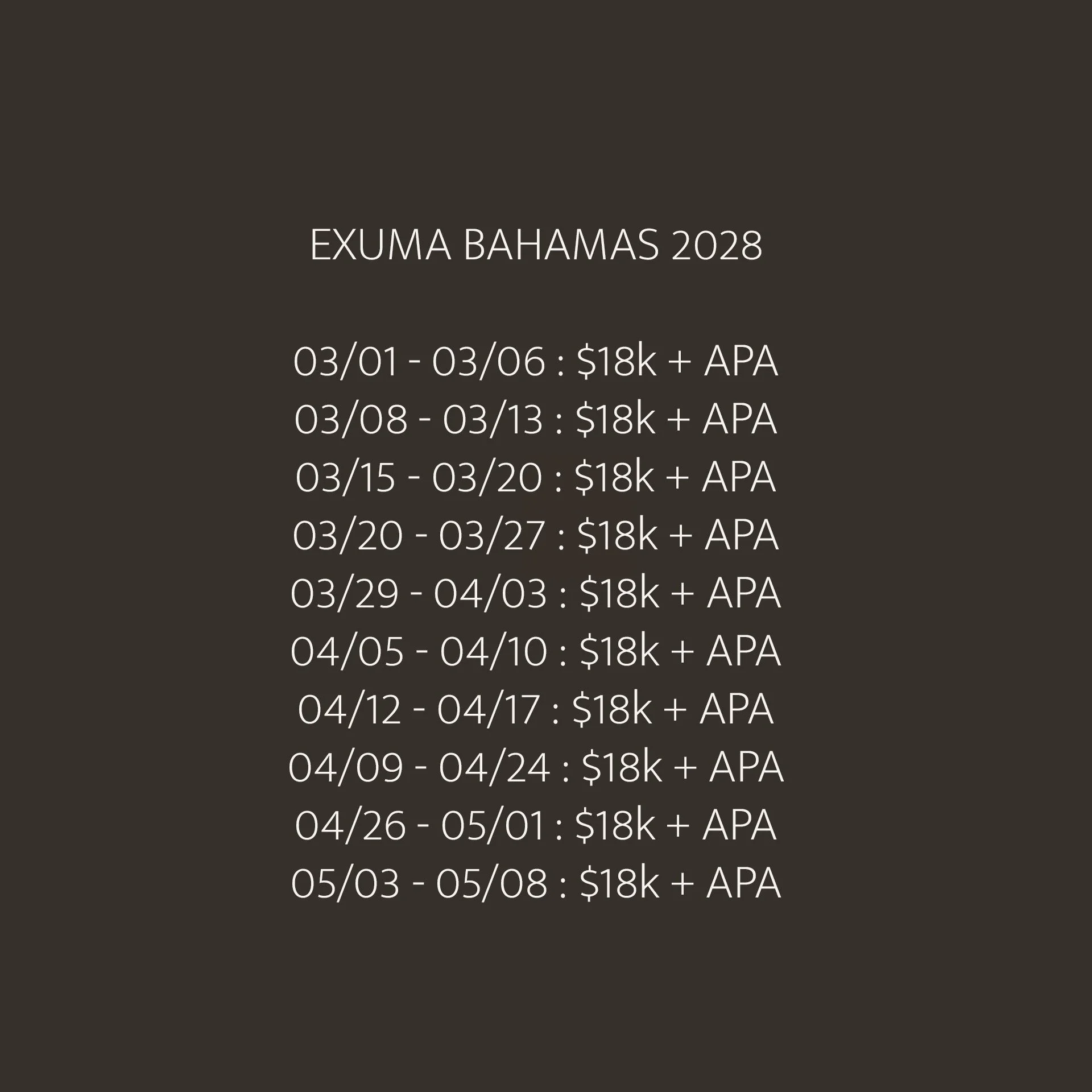 Crew gratuities (industry standard is 20% of the charter price to be split equally amongst the crew, can be pre-paid through APA).